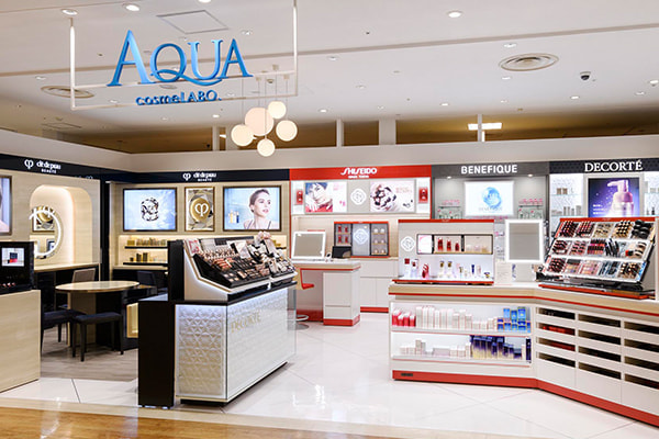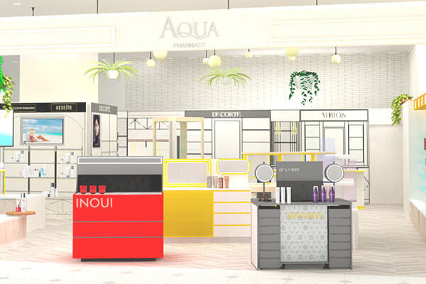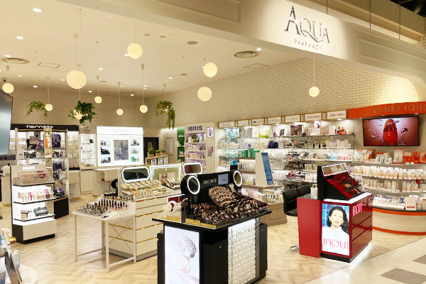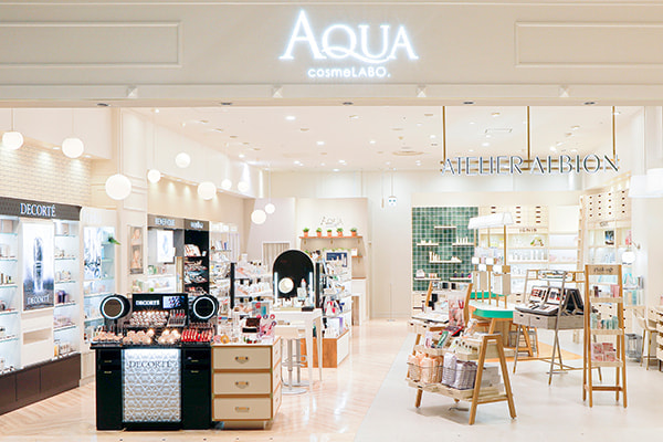 AQUA PHARMACY、AQUA cosme LABO は百貨店のような落ち着いた空間と気軽に相談・体験をできる空間を融合させた化粧品店。